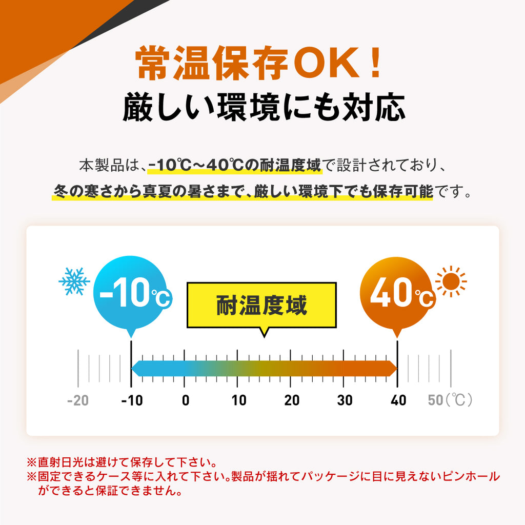 本製品は、-10℃~40℃の耐温度域で設計されており、冬の寒さから真夏の暑さまで、厳しい環境下でも保存可能です。
