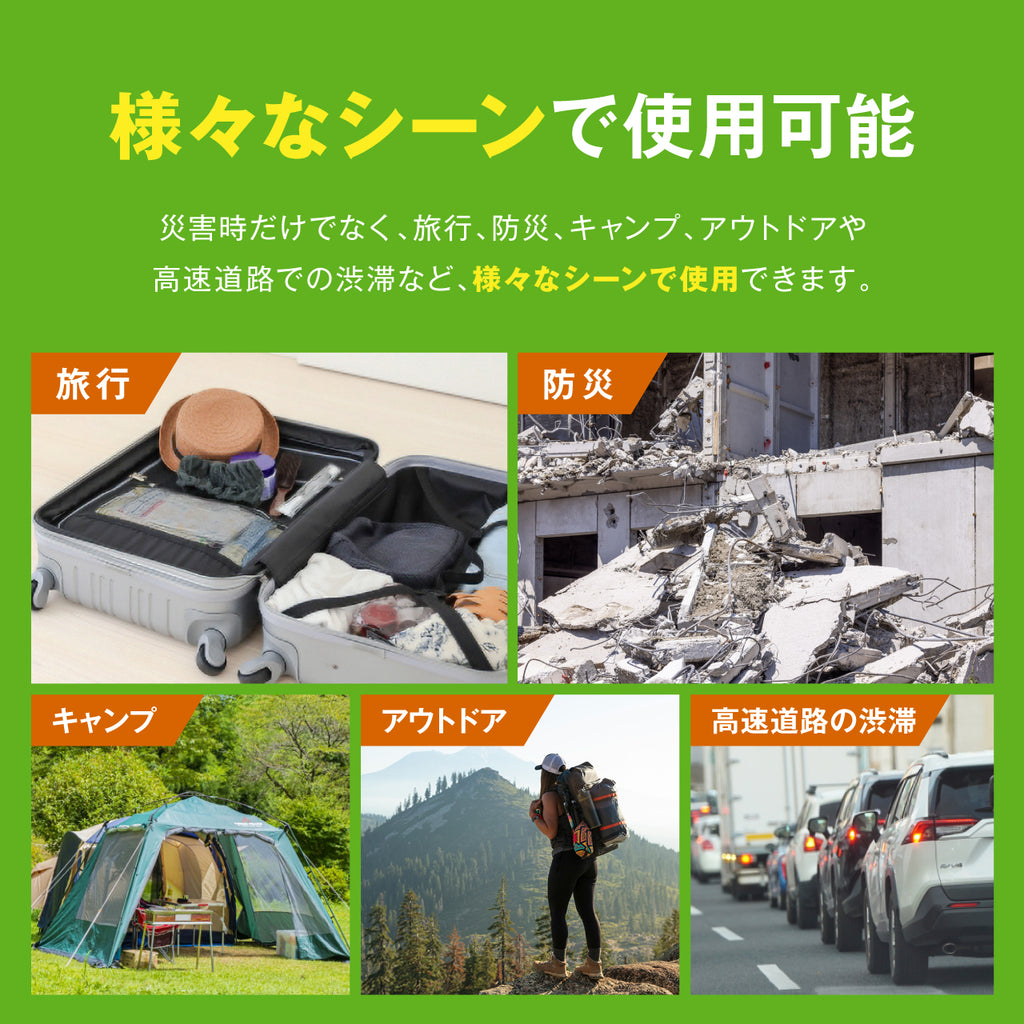 災害時だけでなく、旅行、防災、キャンプ、アウトドアや高速道路での渋滞など、様々なシーンで使用できます。